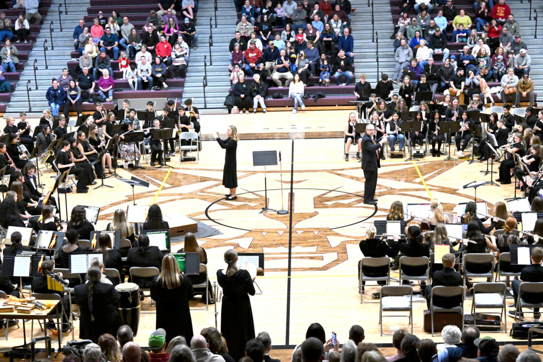 The annual Parade of Bands concert took place Tuesday night at Webster City High School’s Competition Gym. The finale pictured here featured all the bands performing, “Let’s Go Band.” Top left is the sixth grade band, top right is the fifth grade band, bottom right is the seventh and eighth grade band and bottom left is the high school band. Directors are to the Kaitlynn Abens for the high school and Kent Wesselink to the right for the middle school.