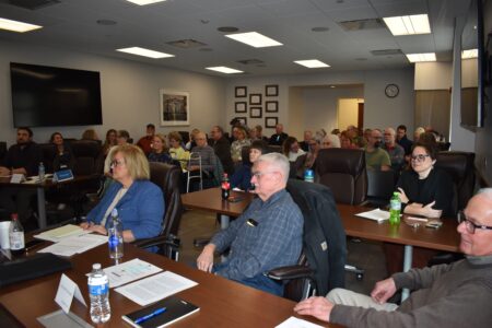 Those attending, in the front seated are Dedra Nerland, Adam Dickinson and Ann Smith, cutting the ribbon, Beth Chelesvig and Theresa Rotschafer, former city manager of Webster City. The entire line department was on hand for the ribbon cutting which includes Brady Newman, Brody Berninghaus, Dana Casey, Doug McCollough, Kooper Jondal, Russell Mourton, Ryan Orton, Derrick Barnes and Wilson Lofstedt, as were many of the city staff, Mike Finnegan of Cornbelt Power, Mayor John Hawkins,City Manager John Harrenstein, Webster City Chamber of Commerce Exeutive Director Jamie Griffith, the Chamber ambassadors and a representative from Joni Ernst's office.