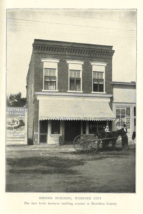 The first brick building in Webster City was the Rhodes building.