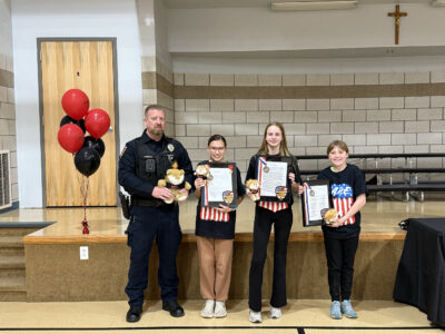The D.A.R.E. essay winners were each given a framed copy of their essay, a ribbon and a Daren, the mascot of the D.A.R.E. program. They are, from left to right: Officer Steve Thumma, Finley Williams, who received the top award, Liana Veldhuizen, and Gracyn Woodward.