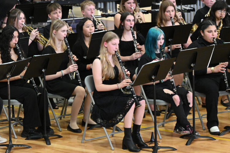The seventh and eigthth grade clarinet and trumpet sections perform during Tuesday’s Parade of Bands, a combined Webster City Middle and High School event held at the competition gym at the high school