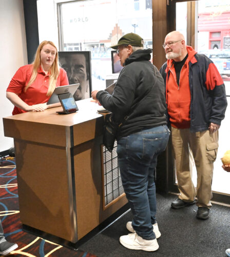Madison Pingel, Webster Theater manager, sells the first tickets to Thursday’s opening night at the movie house in downtown Webster City to Brenda and Stephen Sinnett, of Webster City.