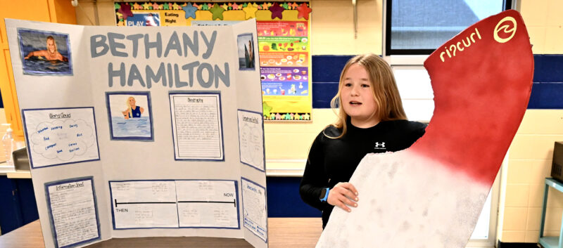 Paeslie Pruisman, sixth-grader at Northeast Hamilton, depicts surfer Bethany Hamilton Thursday during the annual Mrs. Seiser's Night of the Living Wax Museum presented by NEH fifth- and sixth-graders.
