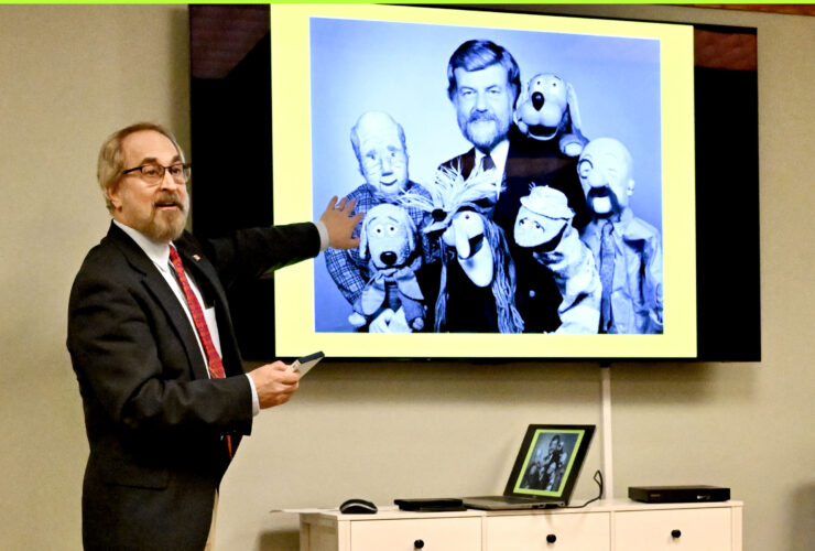 Presenter Jeff Stein talks about The Floppy Show, created by Duane Ellett, along with some of Ellett’s other puppet creations from the Sunday morning program called the “Floppytown Gazette” during a presentation at Kendall Young Library Saturday afternoon.