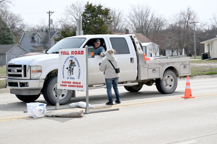 Bruce Coleman, of Webster City, stops on Superior Street to make a donation to Cherie Rawlings, of Webster City, for the Pony Express Express Riders of Iowa, a nonprofit dedicated to raising money for people with disabilities. All monies collected are donated to Easterseals Camp Sunnyside, a ...