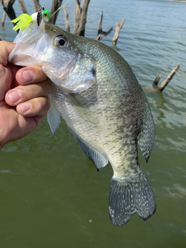 When crappies are the goal, there are lots of choices. Start with a jig tipped with a Mr. Crappie Tube. Usually a jig/plastic will get a crappie to bite, but if not, tie on a Shoo Shiner Jig and tip it with a small minnow. If there is a crappie or other panfish in the area, it will eat this offering.