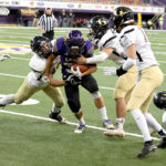 Three Glenwood defenders converge on Payton Kannuan during a Class 3A state semifinal game inside the UNI-Dome in Cedar Falls last November. Kannuan, a WCHS senior, has been selected to play in the Shrine Bowl. DFJ photo/Troy Banning