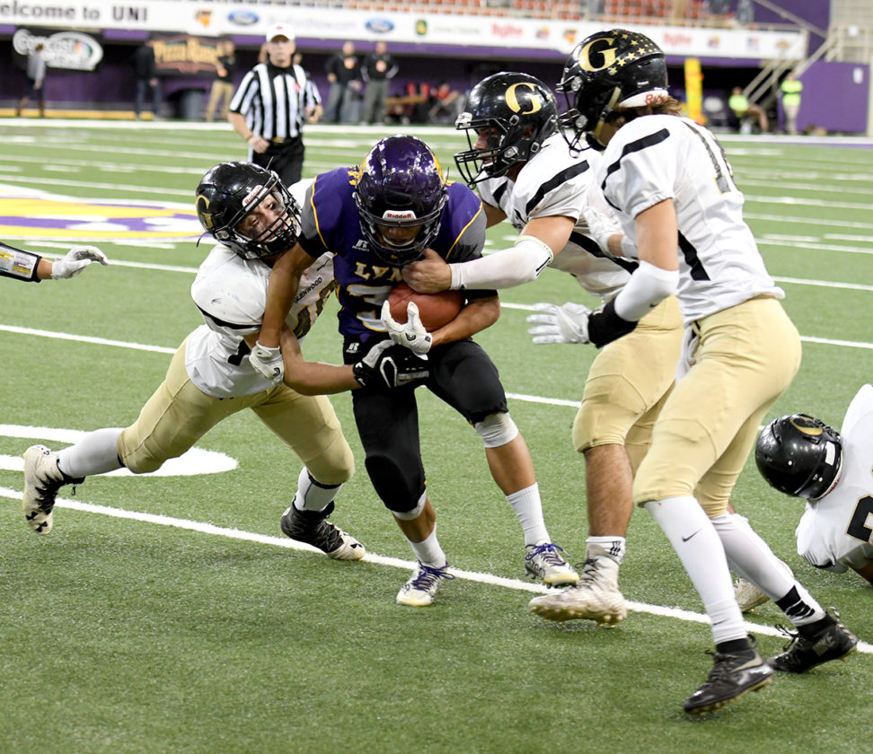 - Three Glenwood defenders converge on Payton Kannuan during a Class 3A state semifinal game inside the UNI-Dome in Cedar Falls last November. Kannuan, a WCHS senior, has been selected to play in the Shrine Bowl. DFJ photo/Troy Banning