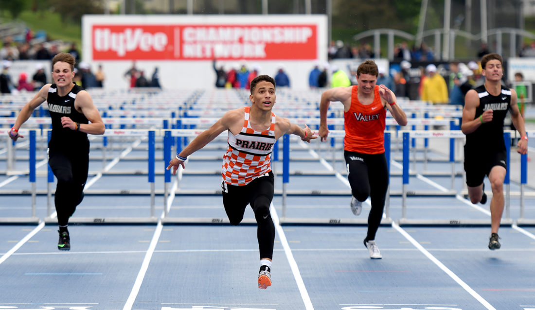 •A day after setting the all-time state record in the 110 high hurdles (13.91 seconds), Cedar Rapids Prairie’s Joah Banks won his second straight 4A title in the event in 13.98 on Saturday.