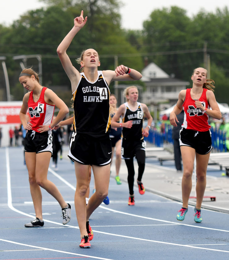 Mid-Prairie's Anna Hostetler pulled off the triple-distance gold at the state meet. She won the Class 2A 800, 1,500 and 3,000 meters. DFJ photo/Troy Banning