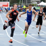 West Burlington Notre Dame senior Isaiah Trousil (center) storms down the track on his way to the Class 3A 100-meter dash state title on Saturday at Drake Stadium in Des Moines. DFJ photo/Troy Banning