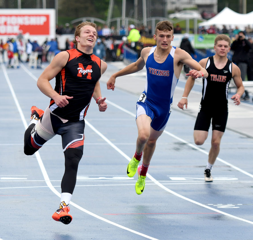 - Madrid senior Michael Santi (left) is all smiles after winning the boys’ Class 2A 100-meter dash at the state meet on Saturday. DFJ photo/Troy Banning