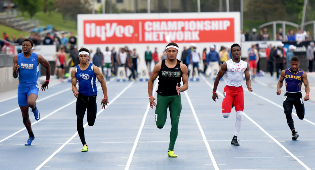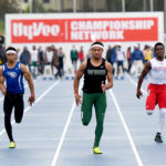 - West Burlington Notre Dame senior Isaiah Trousil (center) storms down the track on his way to the Class 3A 100-meter dash state title on Saturday at Drake Stadium in Des Moines. DFJ photo/Troy Banning