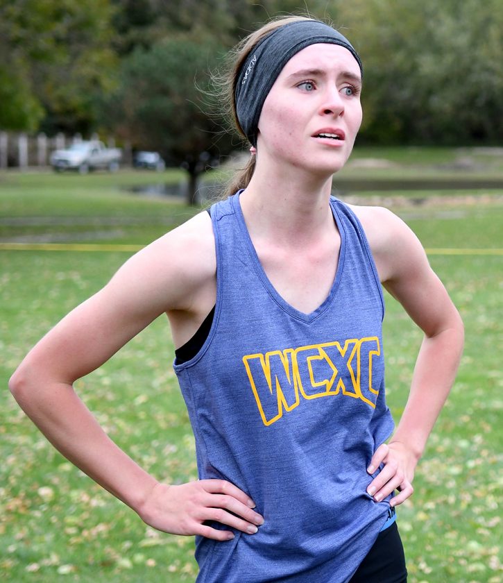 WCHS junior Kaelyn Butz catches her breath moments after matching her career best time and placing 11th at Tuesday’s NCC meet. DFJ photo/Troy Banning