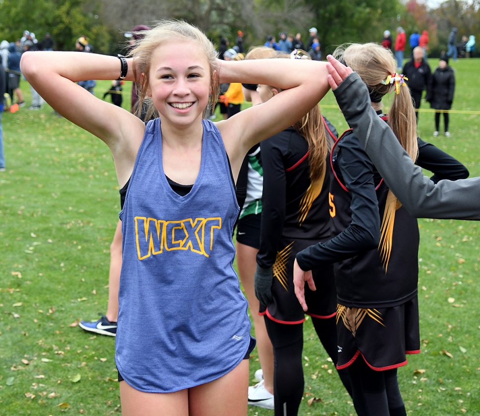 - WCHS freshman Emma Peck is all smiles after finishing 23rd at Tuesday’s NCC meet in Webster City. DFJ photo/Troy Banning