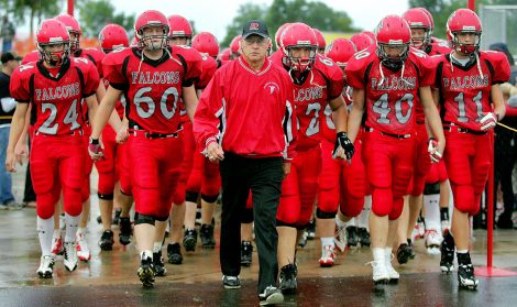 Ed Thomas (center) leads his Aplington-Parkersburg football team onto the field prior to a game on Sept. 5, 2008. It was the Falcons’ first game following a devastating F5 tornado that leveled Parkersburg less than four months earlier and Thomas spearheaded his community’s rebirth. Less than a year later, Thomas was tragically killed by a former player in the school’s weight room. AP file photo