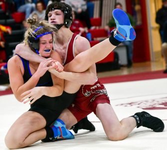 - South Hamilton’s Carter Stolee (top) tosses Des Moines North-Hoover’s Jack Rattray to the mat last night during their 152-pound bout. DFJ photo/Angela Hewitt
