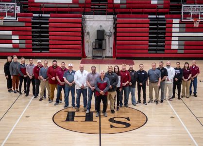 Many current and several former South Hamilton coaches posed with soon-to-be retired athletic director Todd Coy in late April. Pictured are (left to right) Staci Thompson, Savana Berg, Amy Klemp, Matt Juber, Darrell Paulsen, Trev Houck, Cole Swenson, Dennis Barkema, Steve Butler, Paul Skartvedt, Mike Grove, Todd Coy, Lance Keller, Kayla Schaufenbuel, Mark Henderson, Carlton Ness, Dan Brodie, Corey Klemp, Kyle Galetich, Brent Grove, Kathi Fisher, Emily Bochmann and Jay Heeren. A member of the South Hamilton faculty for 34 years, Coy has been the school’s athletic director since 1996. He will say goodbye to the school and enter retirement next week. DFJ photo/Troy Banning