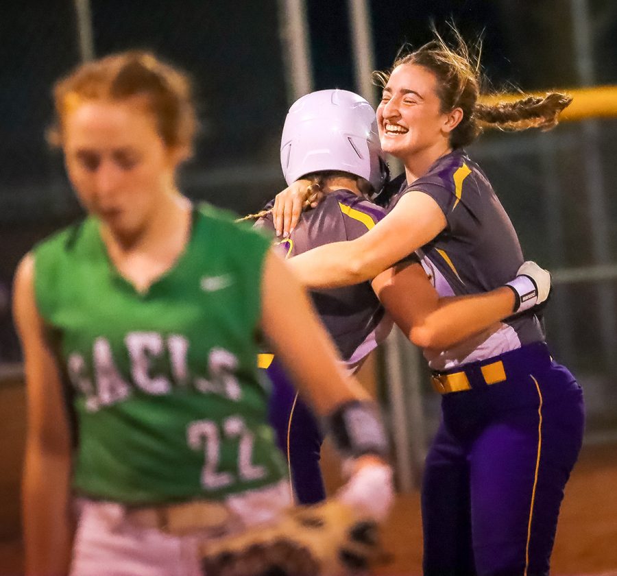 WCHS senior Kelly Stoakes (right) nearly tackles Delainey Bargfrede after Bargfrede delivered the game-winning, walk-off two-RBI single in the Lynx come-from-behind 3-2 win over St. Edmond Wednesday night at Lynx Field. Photo by Jodie Casey