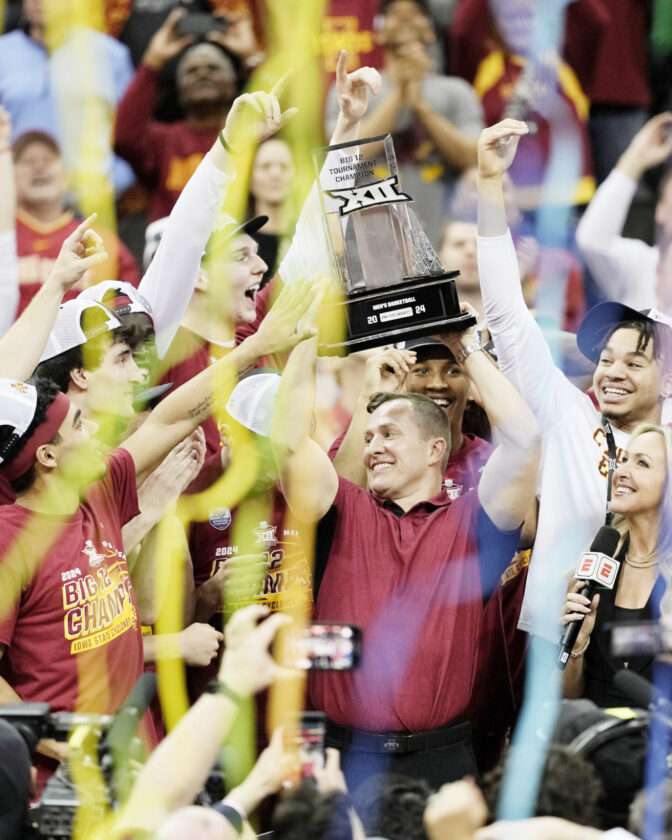 Iowa State head coach T.J. Otzelberger hoists the trophy after his Iowa State Cyclones won the Big 12 championship in Kansas City last Saturday. (AP Photo/Charlie Riedel)