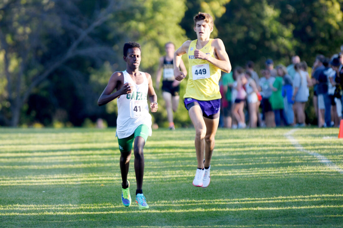 -Messenger photo by Britt Kudla Liam Shannon of St. Edmond passes Webster City Justin Callahan during Webster City boys 5k run on Tuesday at Links Golf Course