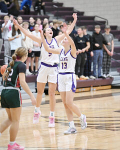 WEBSTER CITY PLAYERS Evie Davis and Jaylyn Bahrenfuss (13) celebrate their home win over Boone on Friday. (DFJ photo by David Borer)