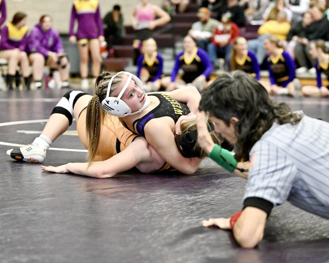 webster city’s kali hartnett looks at the referee as she is gets ready to pin her opponent in Webster City on Monday. (DFJ Photo by David Borer)