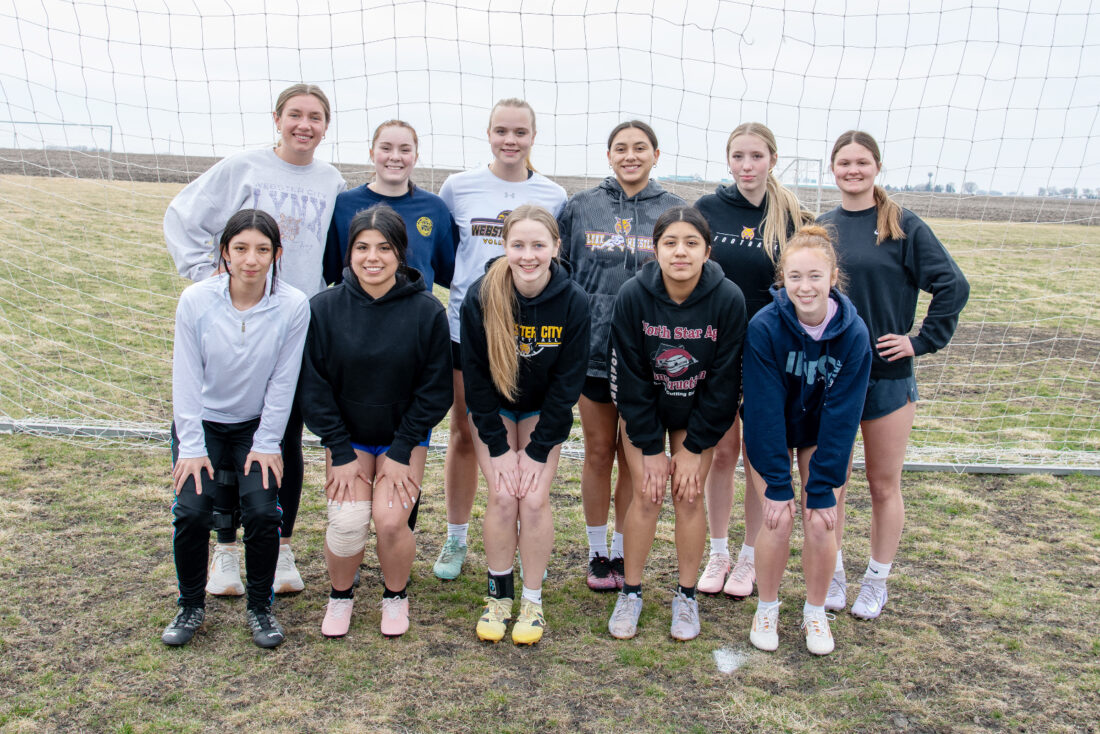 RETURNING LETTERWINNERS FOR THE WEBSTER CITY GIRLS SOCCER SQUAD are, front row (left to right): Naomi Ortiz, Sandra Cruz, Megan VanDeer, Jayme Perez and Julia Griep. Back: Lovie Pruismann, Kate Feltz, Ashlee Nydegger, Heidi Mendoza, Fina Johnson and Janey Putney. (Photo by Patrick Coons)