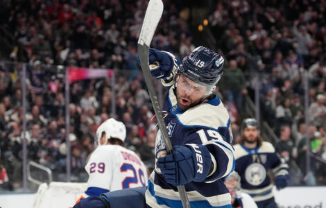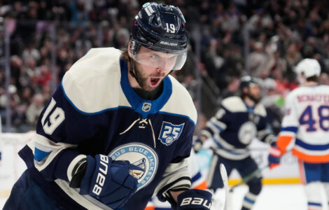 LAS VEGAS (AP) — Reilly Smith scored twice, Mark Stone extended his goal streak to six games and the Vegas Golden Knights overcame an early injury to goalie Carter Hart, rallying past the Columbus Blue Jackets 5-3 on Thursday night.