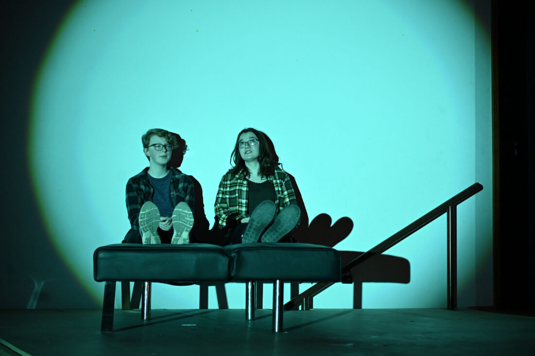 Above, Brooklyn Neddermeyer (left) and Brooklin Watson (right) hold a dialogue in “A Father is a Chocolate Mammoth.” The one-act play was written by WCHS alumna Charlotte Judkins.